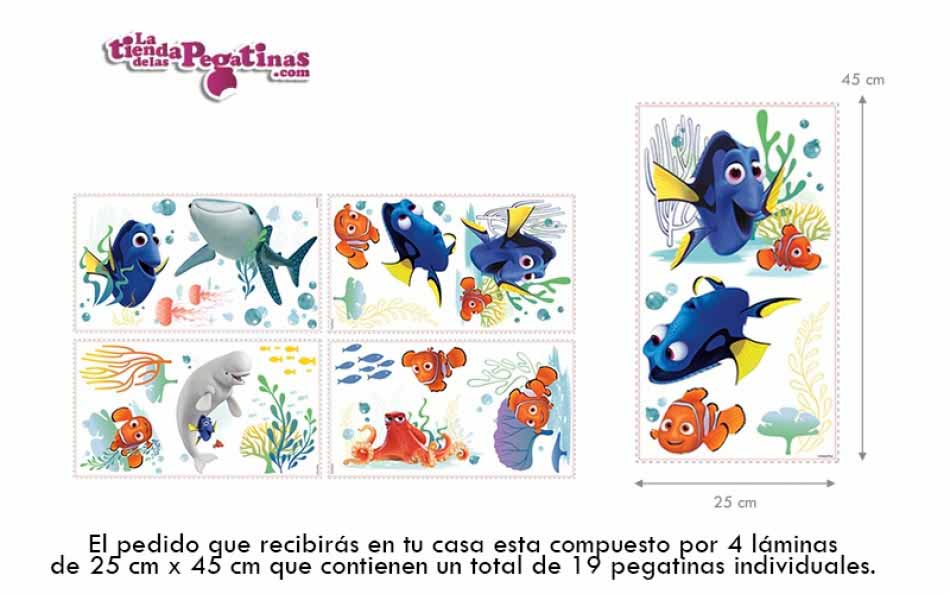 Vinilo decorativo infantil con los personajes de Disney Pixar "Buscando a Dory". Un vinilo formado por 4 láminas de 25 cm de ancho por 45 cm de alto y que está compuesto por un total de 19 pegatinas. Un mundo mágico bajo el mar donde nos encontraremos entre otros a Dory, Nemo, una ballena beluga llamada Bailey, un tiburón ballena conocido como Destiny y a Hank, un pulpo cascarrabias, además de múltiples elementos submarinos perfectos para decorar la habitación o la sala de juegos de los más pequeños de la casa. Unos stickers que son tan fáciles de aplicar que te podrán ayudar tus propios hijos, y que además nos permiten pegarlos y despegarlos varias veces durante su colocación. (La medida del vinilo se corresponde con la disposición de las laminas de la previsualización).